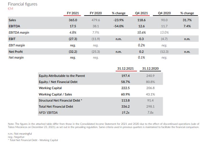 - Sales for 2021 stood at €365 M, down 23.9% on the previous year and down almost 50% on pre-COVID-19 years. The EBITDA stood at €17.5 M, with a margin of 4.8%.